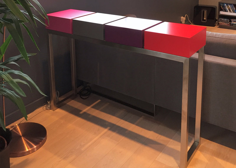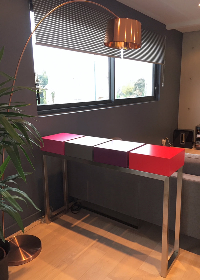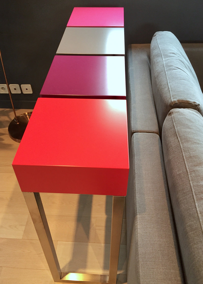 Matériaux, finitions : inox brossé, laque contemporaine sur MDF couleurs sur mesure dans la palette Les Pieds Sur La Table fuchsia, fauve, aubergine, orange pop.