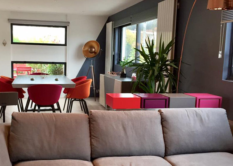 La console connectée Plug&Pied de la collection Les Pieds Sur La Table est ici déclinée en version 4 cubes de couleurs pétillantes pour cet appartement entièrement rénové. Adossée au canapé du salon, les cubes aubergine et fuchsia de la console sont des tiroirs équipés de prises électriques permettant à la famille de recharger ses téléphones mobiles facilement. Une collaboration réussie avec ATDECO agence en décoration d’intérieur.